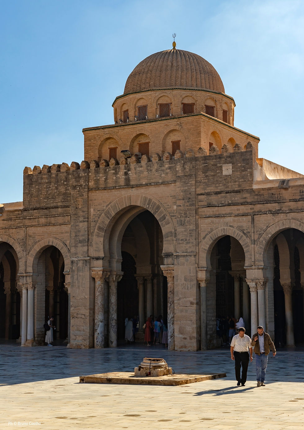 Au cœur des plaines d’Ifriqiya, là où la terre ocre se confond avec la lumière, s’élève une cité dont le nom semble porter le murmure des siècles. Kairouan. Ville de poussière et de savoir, de pas lents et de manuscrits feuilletés à l’ombre des arcades. En son centre, la Grande Mosquée se dresse comme une respiration ancienne, une architecture habitée par la mémoire des hommes et la patience de Dieu.